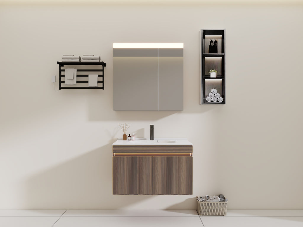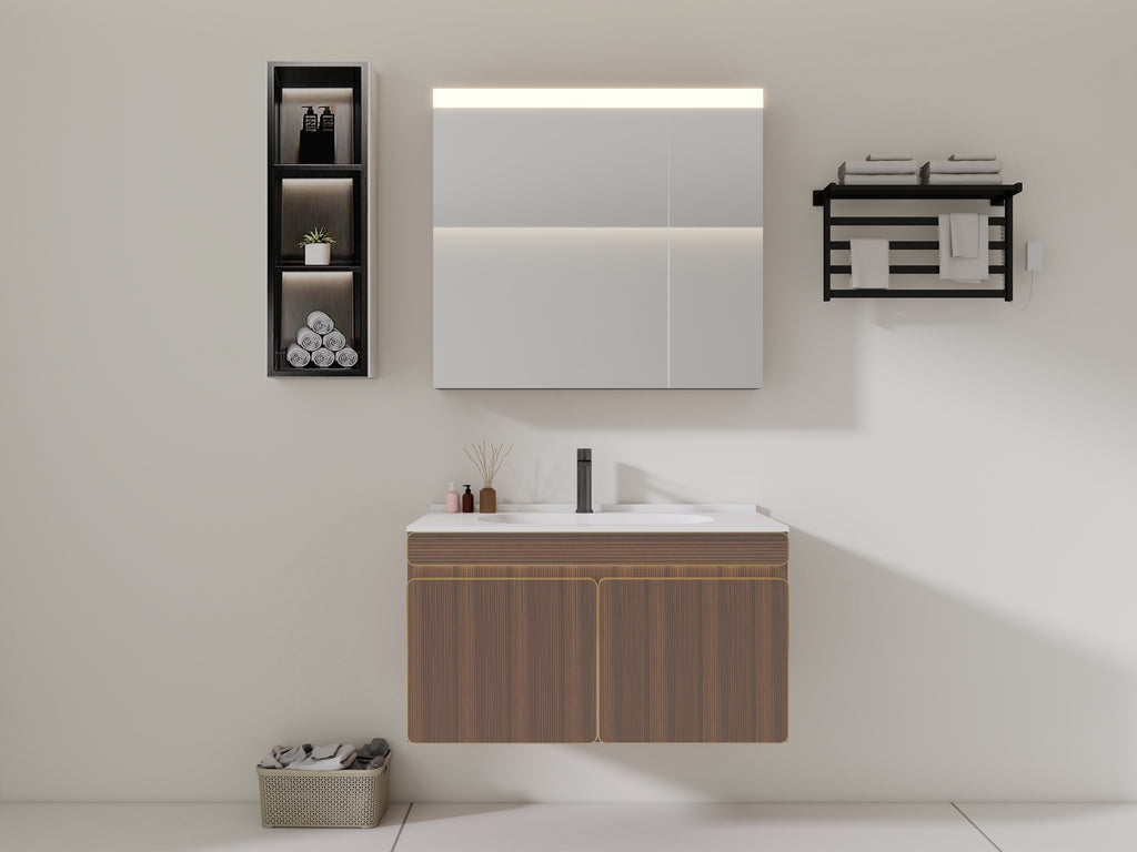 Linkaa - Dark Wood Dressing Table | Matte White Sintered Stone Countertop | Motion Sensor Waterproof LED Light